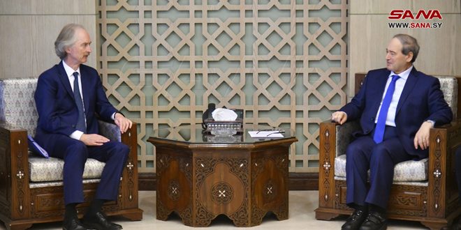 بحث وزير الخارجية والمغتربين الدكتور فيصل المقداد مع المبعوث الخاص للأمين العام للأمم المتحدة إلى سورية غير بيدرسون، آخر التطورات المتعلقة بالقضايا ذات الاهتمام المشترك، ومستجدات الوضع في سورية.